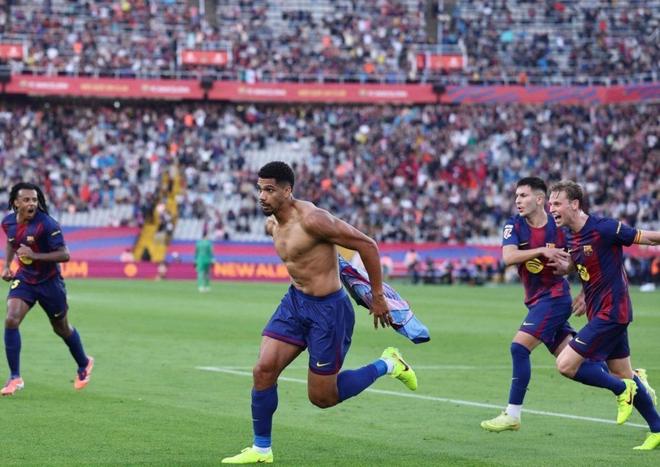 第93分钟,巴萨右路推进,德容下底传中,客串中锋的阿劳霍抢点,推射破门!绝杀,2-1!进球后,阿劳霍激动地脱下球衣,狂奔庆祝。被罚下的弗里克也是激动怒吼,发泄情绪。